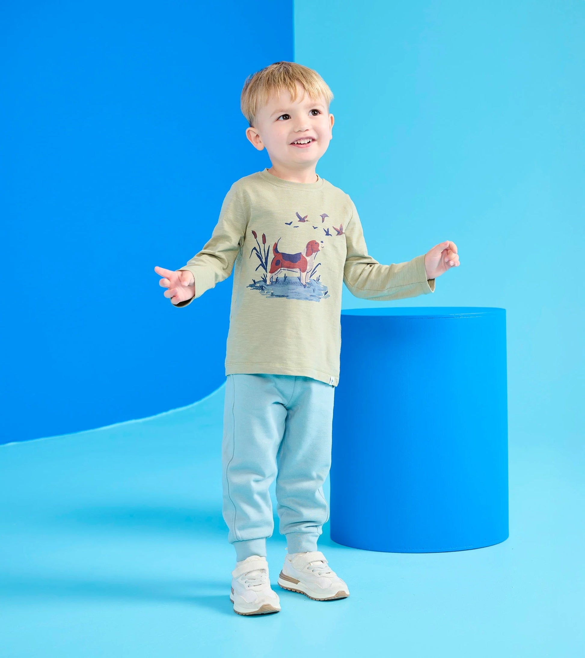 With its playful hunting dogs print, this lounge set is made for pups and play. The long sleeve tee features easy snap closures, while the relaxed fit track pants offer a snug waistband and comfy cuffs. Perfect for fall adventures or weekend naps, this cozy toddler outfit delivers warmth, style, and functionality for every curious explorer.