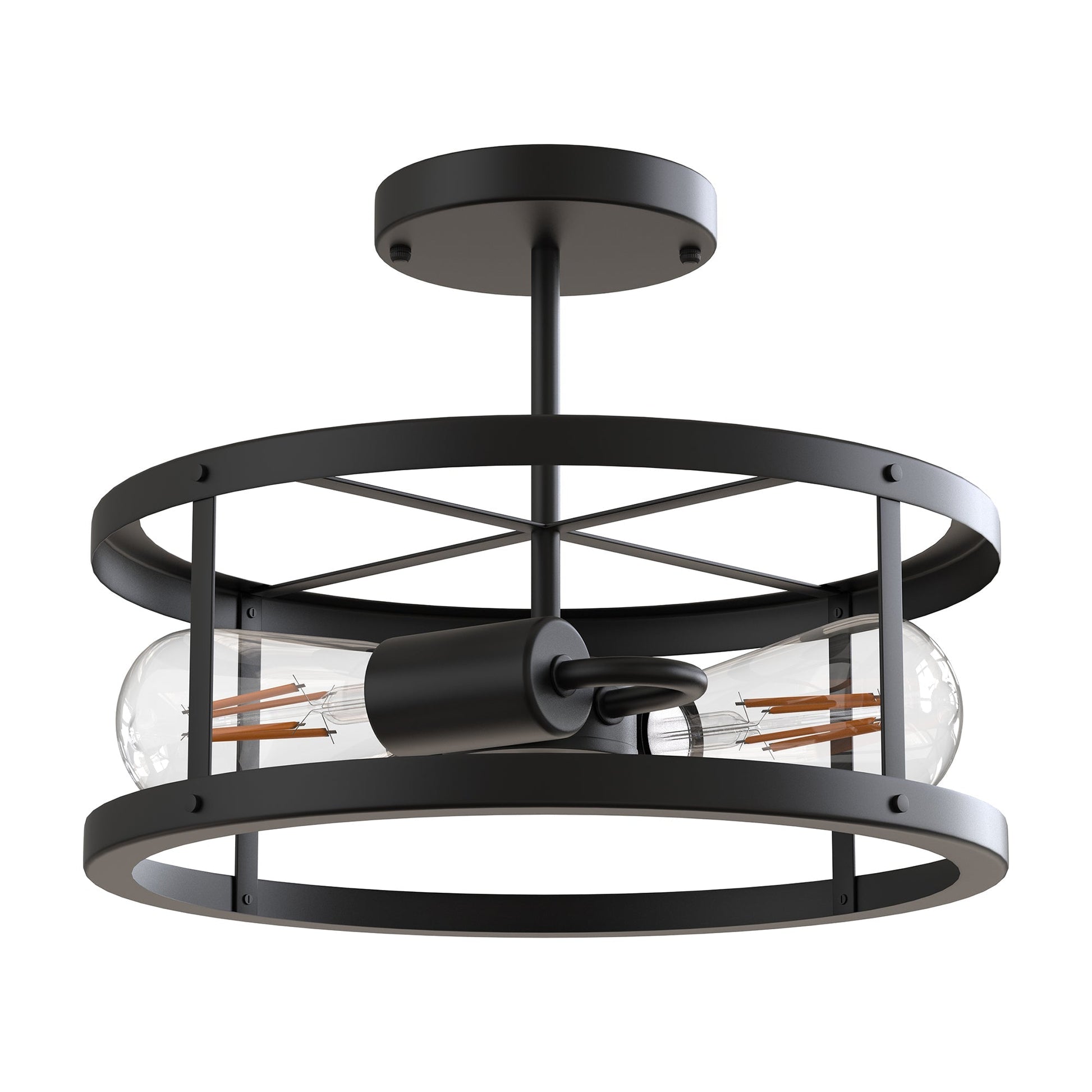 This light is 2-Light Matte Black Drum Semi? Flush Ceiling Light.This rustic drum semi flushmount ceiling light fixture features a modern-inspired accent that makes a statement in your room space.? This glass ceiling light fixture is perfect for a typical kitchen, dining room, living room, bedroom, or foyer.